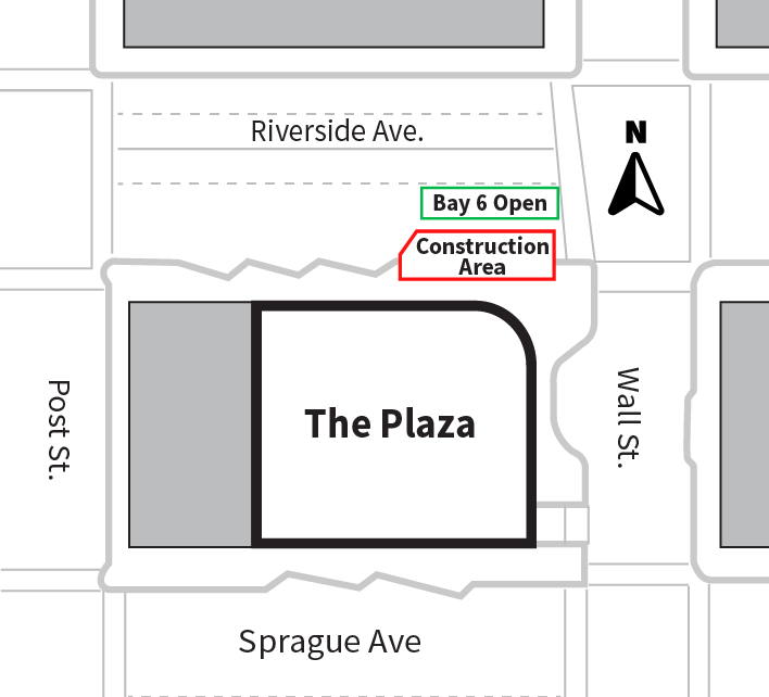 A new bus shelter and rider amenities are being installed at Plaza Bay 6. Riders may continue to use Bay 6 as the bus will stop parallel to the construction fencing on Riverside Avenue.
