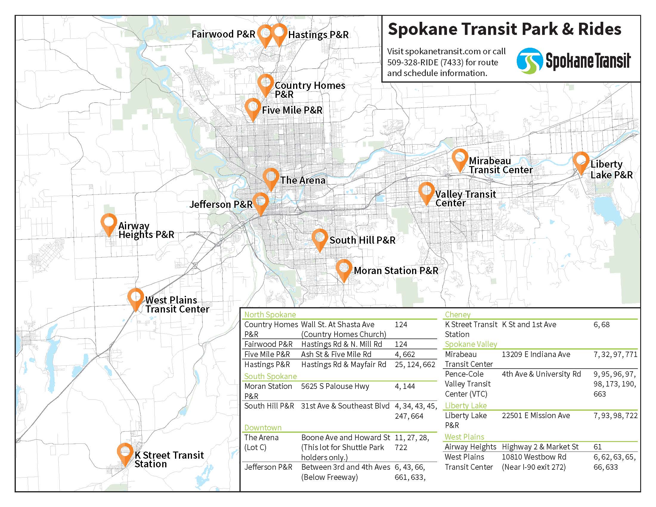 Airway Heights: Highway 2 & Market St (near Yoke’s). Routes 61 and 65 serve this lot.